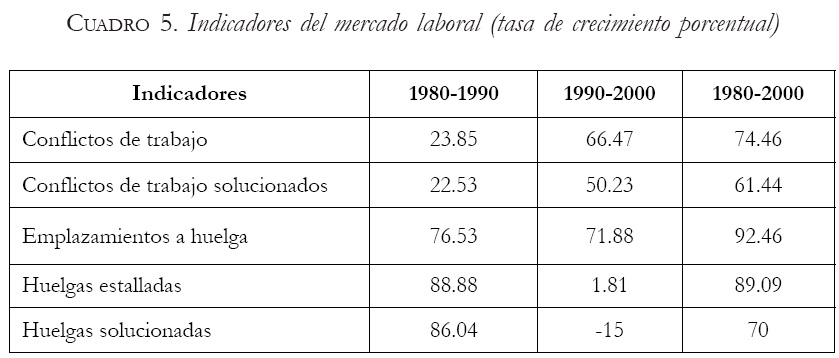 Los resultados del análisis de cambio institucional para el caso de las relaciones salariales se muestran en el cuadro 5. Los datos encontrados sugieren que durante la década de los noventa hubo un incremento importante en la eficiencia de las instituciones que regulan las relaciones de trabajo, en virtud de que la tasa de crecimiento de los conflictos laborales (TcCL) aumentó alrededor de 40% de una década a otra, mientras que los conflictos de trabajo solucionados (TcCLS) lo hicieron a una tasa de 50%, lo que significa que creció más la capacidad de las instituciones para resolver conflictos laborales que el número total de conflictos. En cuanto a los emplazamientos a huelga, en la misma década, la tasa de crecimiento (TcEH) fue de alrededor de 5%, menor a la TcEH de la década anterior. Esto significa que a pesar de que el número de empresas en el estado es mayor por razones obvias vinculadas a la propia dinámica económica, la tendencia a huelga decreció, lo que implica no sólo que las instituciones reguladoras de las relaciones de trabajo fueron más eficientes durante los noventa, sino también que existe un mayor nivel de satisfacción de los grupos trabajadores. Otro indicador que fortalece este resultado es el de la tasa de crecimiento de las huelgas estalladas (TcHE), que durante los ochenta creció cerca de 89% y durante los noventa sólo lo hizo en 12%. El único indicador que contrasta con los resultados anteriores es el de la tasa de crecimiento de las huelgas solucionadas (TcHS), ya que en la década de los noventa disminuye en 15%. Esto, que pudiera sugerir una reducción de la capacidad de las instituciones para resolver conflictos, podría simplemente reflejar la imposibilidad de las partes para llegar a acuerdos, lo que podría tener poco que ver con las propias instituciones y más con una menor intervención del gobierno en estos conflictos. Sin embargo, este resultado es insuficiente para rechazar la existencia de un ambiente laboral más amigable.