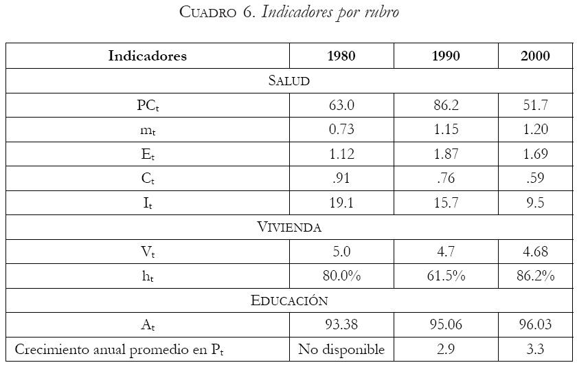 Los resultados del análisis de indicadores sociales se muestran en el cuadro 6, que en general sugiere que de los ocho indicadores de bienestar social considerados, tres mejoran, tres empeoran y dos permanecen prácticamente sin cambio durante el período de 1980 a 1990. De forma similar, dos mejoran, tres empeoran y dos se mantienen sin cambio durante el período 1990-2000. Los indicadores que mejoran durante el primer período son algunos referentes a la infraestructura médica tales como PCt, mt y Et, así como It, que mejora sensiblemente. Durante este período se nota una caída importante en el indicador de vivienda ht, mientras que el otro indicador (Vt) permanece prácticamente sin cambios. En el rubro de educación, ilustrado con el indicador At, no existen variaciones significativas. Durante el período 1990-2000, los indicadores de salud se deterioran, pues tres de ellos caen (PCt, Et y Ct) y uno (mt) permanece sin cambios. Por su parte, el rubro de educación, representado por At, no presenta modificaciones con respecto a la década anterior, mientras que el de vivienda mejora sensiblemente, impulsado por el indicador ht.