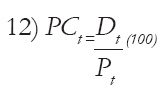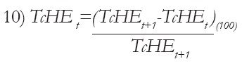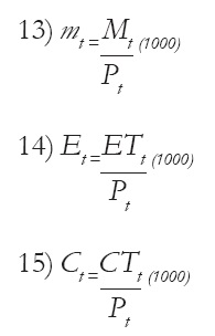 donde PCt, D t y P t se refieren, respectivamente, a la proporción de población con cobertura de salud, al total de derechohabientes y al total de la población en el período t. Otros indicadores son los representados en las fórmulas 13, 14 y 15: el número de médicos (mt), enfermeras (Et) y camas de hospitales (Ct) por cada 1 000 personas.