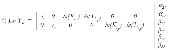 7) Ln Yit = a2,1 td1+ a2,2 td2 + β11 In (Ki1) + β21 In (Li1) + β12 In (Ki2) + β22 In (Li2)