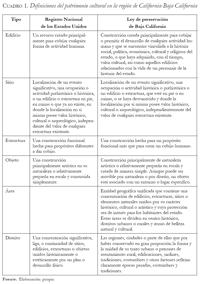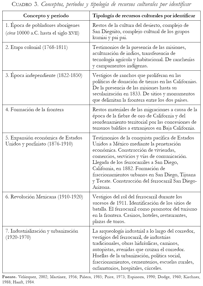 En Estados Unidos, país donde se originan o continúan las rutas de muchos de los ferrocarriles mexicanos, existen catálogos de arqueología industrial y de recursos naturales, obras que pueden complementar la información de México. Con fines de planeación urbana y regional binacional, convendría unificar criterios de clasificación de recursos del corredor adoptando el sistema estadounidense como base, ya que éste clasifica los recursos culturales en edificios, objetos, estructuras, sitios y áreas, mientras que el mexicano divide el patrimonio en monumentos prehispánicos, históricos y artísticos, con lo cual se excluyen ejemplos del pasado reciente y de la arqueología industrial así como las áreas geográficas. Ya que la Ley de preservación del patrimonio cultural de Baja California es compatible con las definiciones del National Park Service, se podrían crear tipologías de recursos culturales en una misma categorización para todo el corredor (véase el cuadro 1).