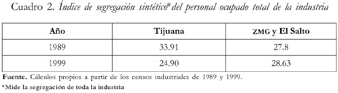 El estudio de la segregación se justifica, en este caso, porque no es analizada dentro del conjunto laboral (en donde hay muchas ocupaciones), sino más bien al interior de la industria (con pocas ocupaciones: obrero industrial). Por lo tanto, no merma el análisis el hecho de que los índices de segregación obtenidos para 1999 sean bajos en ambas regiones (fronteriza, 25%, y centro-occidente, 29%).