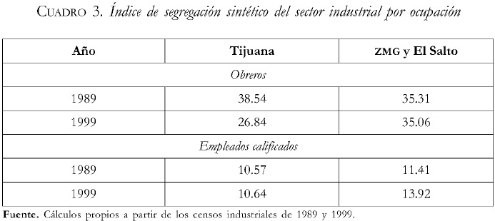 De acuerdo con el cuadro anterior, Tijuana, manteniendo el mismo modelo industrial de exportación, tiene un índice de segregación mayor en 1989 y menor en 1999, en comparación con la ZMG y El Salto, que presenta un modelo mixto de industrialización (tanto de industria por sustitución de importaciones como de industria orientada a la exportación). Por tanto, se considera que la convergencia de ambas regiones hacia un modelo industrial de exportación no implica una menor segregación. En otras palabras, a modelos diferentes de industrialización se presentan índices diferentes de segregación. Enseguida veremos qué sucede con el índice de segregación en el nivel de ocupación.