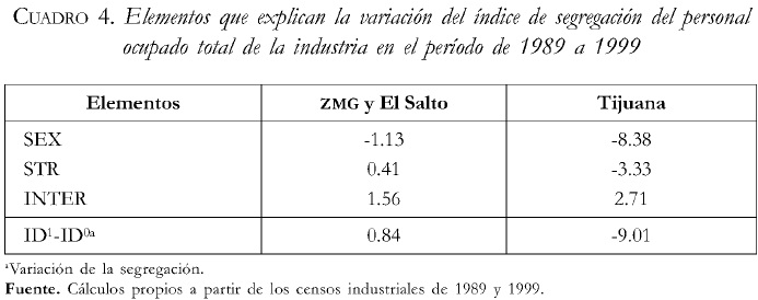 Los valores de los elementos que explican la variación del índice de segregación del personal ocupado total de la industria en el período, se presentan en el cuadro 4. Durante la evolución, en el caso de Tijuana, la variación en su índice se debió a una disminución de la segregación con -8.38 puntos y a la estructura del empleo con -3.33 puntos. En esta parte del análisis, la interdependencia no es el elemento principal que mantiene la segregación sin cambios, sino más bien se debe a la segregación y a la estructura del empleo de manera aislada. Si recordamos que, en 1999, la región fronteriza registra una disminución de nueve puntos en su índice de segregación, podemos decir que hubo un cambio en la contratación de hombres y mujeres en Tijuana, el cual redujo la segregación en la industria.