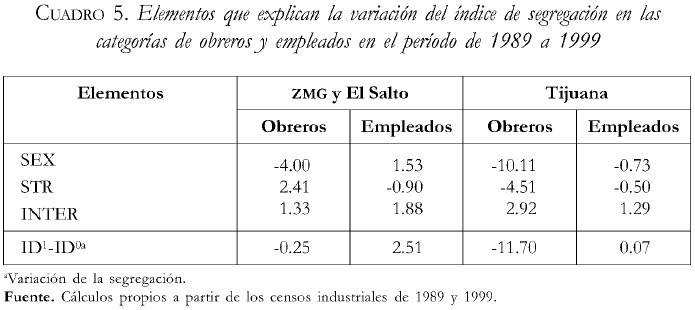 El análisis evolutivo de la variación del índice de segregación en las categorías de obreros y empleados calificados durante el período de 1989 a 1999 se presenta en el cuadro 5. En el caso de Tijuana, se observa que una disminución de la segregación en los obreros -aunque el índice de ésta es mayor a la que se registra entre el personal ocupado total- se debió a la influencia de la segregación con -10.11 puntos, seguida de la estructura del empleo, con -4.51 puntos. Este resultado nos permite advertir una reducción de la segregación efectiva para los obreros en Tijuana.