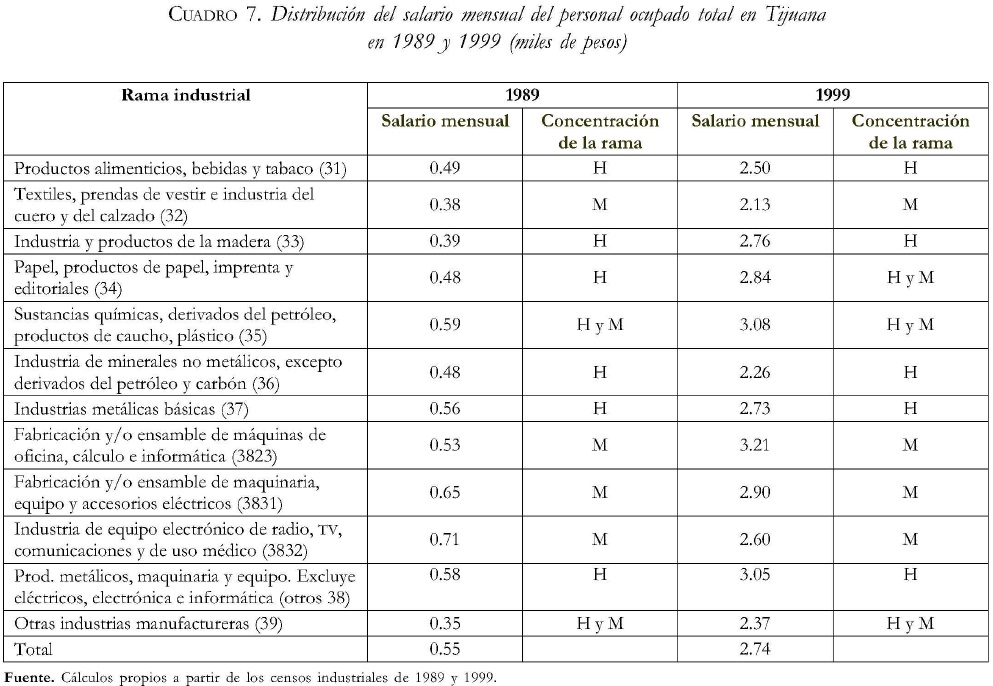 En Tijuana, en 1999, la mayor remuneración para un trabajador industrial la podemos observar (cuadro 7) en la industria del software (femenina), en la de sustancias químicas (equilibrada) y en otras ramas del subsector 38 (masculinas). En cambio, las ramas en donde la remuneración es baja corresponden a la industria textil (femenina), a la de productos minerales no metálicos (masculina) y otras industrias manufactureras (equilibrada).