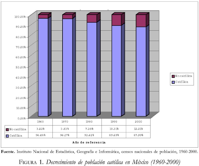 Posiblemente uno de los indicadores más evidentes -aunque solamente refleje de manera superficial las transformaciones del campo religioso es el constante decremento en el porcentaje de población católica que registran los censos nacionales de población,2 el cual descendió casi cuatro puntos porcentuales de 1960 a 1980 -pasando de 96.48% a 92.62%- y disminuyó otro tanto en las siguientes dos décadas, para ubicarse en 87.99%, según el XII Censo general de población j vivienda, 2000 (Instituto Nacional de Estadística, Geografía e Informática, 2001).