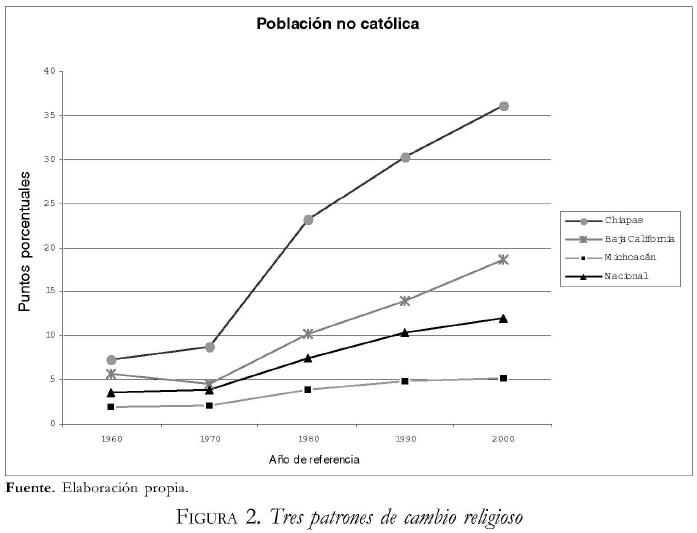 3 Estamos conscientes de las limitaciones de la información contenida en los censos nacionales de población. A pesar de ello, consideramos que esta información permite hacer un primer acercamiento al estudio del cambio religioso en México, que debe ser complementado con el análisis del cambio a través de otras metodologías. Una reflexión sobre los alcances y las limitaciones de la información censal para el análisis del cambio religioso es presentada en De la Torre y Odgers (2003).