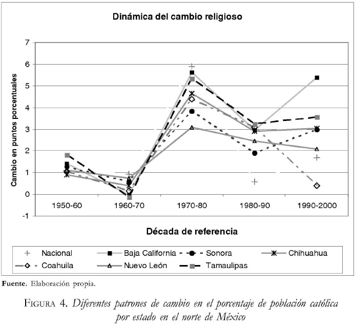 En los estados del norte de México -de manera similar a lo que sucede con la media nacional- podemos observar que en la década 1970-1980 se experimentó un drástico descenso en el porcentaje de población católica. En el período 1980-1990, la tendencia continuó, pero a velocidades muy diferentes para cada uno de los estados. Estas diferencias se acentuaron notablemente en el período 1990-2000, en donde podemos observar que mientras en Baja California vuelve a alcanzar un cambio similar al de la década 1970-1980, en Coahuila registra el nivel más bajo del período.