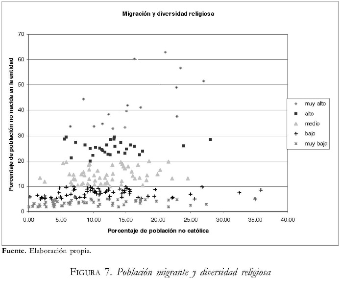 Con la finalidad de identificar en qué medida -y en qué lugares específicos coincide una importante presencia de población migrante con una mayor diversidad religiosa, clasificamos el total de los municipios de los estados fronterizos en cinco grandes grupos, dependiendo del porcentaje de población no nacida en la entidad, registrada por el censo del año 2000 (Instituto Nacional de Estadística, Geografía e Informática, 2001). Como se puede observar en la figura 7, solamente cinco municipios con un alto porcentaje de población migrante presentan también altos porcentajes de población no católica. De esos cinco municipios, tres se ubican en el estado de Baja California (Ro-sarito, Tecate y Ensenada), por lo que podríamos considerar que el elevado porcentaje de población no católica puede corresponder a una dinámica regional y no necesariamente refleja el impacto de la importante presencia de población migrante. De hecho, si consideramos el porcentaje de población no católica como un indicador de diversificación en el ámbito de lo religioso, podemos observar que, con algunas notables excepciones, los municipios en donde existe una mayor proporción de migrantes (personas no nacidas en la entidad) no coinciden con aquéllos en donde es más pronunciada la diversidad religiosa.