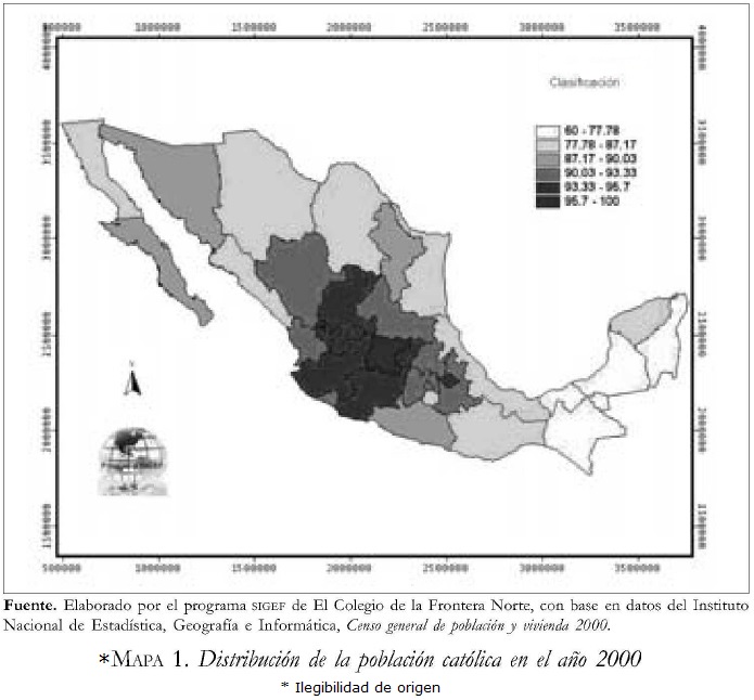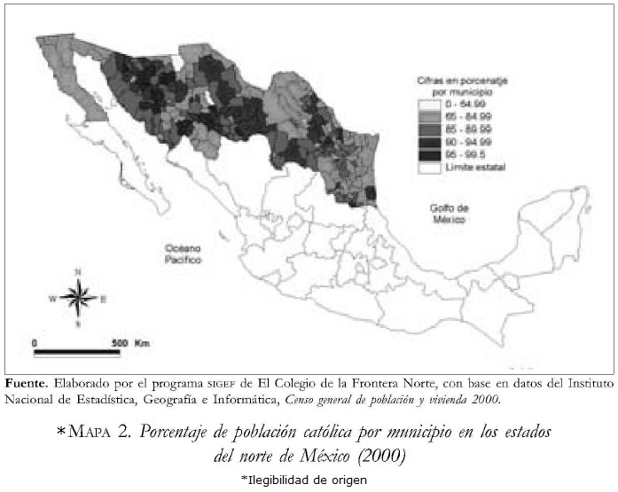 Como se mencionó anteriormente, una aproximación al estudio del campo religioso en México a partir de los datos censales, nos permite elaborar una primera regionalización, según la cual, el norte del país se identificaría como un espacio en donde la hegemonía del catolicismo no es tan acentuada como en el centro de México, pero la presencia del protestantismo no es tampoco tan importante como en los estados del sur-sureste.