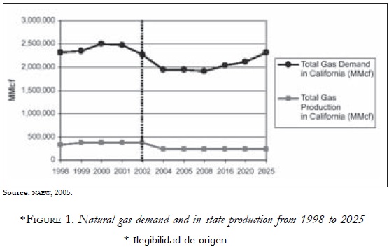 In 2004, the gas demand in California was around 2.0 Tcf (MMMMcf) with an in state production of 0.25 Tcf: 85% of natural gas consumed in California is imported. Over the next two decades, natural gas is expected to play a key role in California's energy system (Figure 1). Around 42% of the electricity produced in the state is from gas, a figure that is expected to rise. Natural gas-fired power plants are preferred, because they emit less air pollution and are more cost effective compared to other fossil-fuelled generation technology (with lower capital and operating costs). The state has environmental objectives were achieved thanks to natural gas. Public debates are numerous in California where public concern about environment protection is taken seriously.