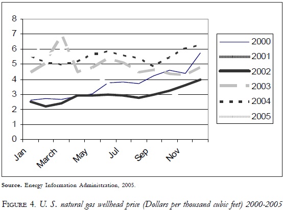 3 In 2004, the average import price of pipeline gas in the U. S. was USD5.81 per MMMBtu, while the importing price was USD5.82, and the one registered at Henry Hub was USD5.85 (Lajous, 2005).