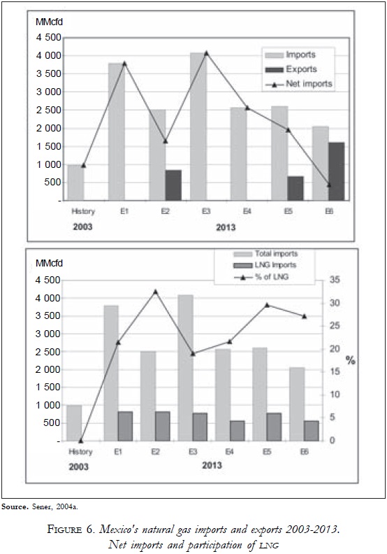 Dependency on foreign supply will increase since the rate of imports/demand would reach 42% for E3 and 41% for the reference case in 2013. Showing another panorama, the E6 scenario considers exports to be 1 613 MMcfd and imports 2 045 MMcfd (Figure 6). These forecasts clearly underline the uncertainties as to whether the indigenous production can be sufficiently increased to satisfy rising demand and eventually export gas to the U. S.