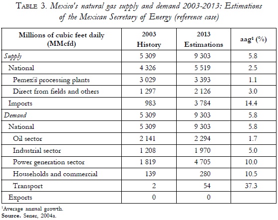 Five LNG terminal projects have received approval to be built in Mexico from the Comisión Reguladora de Energía (CRE-the Mexican Energy Regulatory Commission). Four of them would be installed in Baja California, and one in Altamira, in the State of Tamaulipas (Table 4). However, one of them, scheduled to be developed by Marathon Oil Corp. (Gas Natural Baja California) has been called off in March 2004 after the State of Baja California seized land the company had planned to buy. Additionally, two proposals respectively in Manzanillo and Lázaro Cárdenas (central-Pacific area of the country) are under revision by the cre. For LNG imports to 2013, Sener's study (2004a) only considers the Altamira LNG Project because the Altamira Terminal and the Federal Electricity Commission (CFE) have already signed a long-term supply contract. The other three proposals are still negotiating a supply contract.
