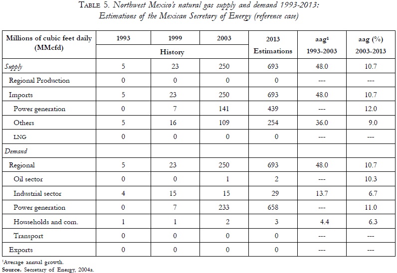 The States of Baja California Sur, Sinaloa, Sonora and Baja California comprise the Northwest region, but natural gas is only supplied and commercialized in the two last ones. Gas consumption has rapidly increased in recent years from 5 MMcfd in 1993 to 250 MMcfd in 2003 (annual growth of 48%), which now represents about 5% of the national figures (Table 5). The power generation sector has mostly contributed to this evolution by rising from 7 MMcfd in 1999 to 233 MMcfd four years later (90% which is regional production).