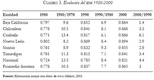 Como reflejo de lo anterior, está el cierre de la brecha de los índices de desarrollo humano10 entre la frontera norte y el resto del país, durante los años setenta y dos mil. La diferencia en el índice se va reduciendo, lo cual sugiere una especie de convergencia entre las regiones de México, en las dos últimas décadas, pero eso no está sucediendo; incluso la mejoría del indicador en la región queda muy abajo del promedio nacional. La entidad que más avanzó fue Coahuila, seguida de Chihuahua y Tamaulipas, después Sonora y Nuevo León, quedando Baja California al último, explicable por la relevancia del PIBPC en el IDH y que sea la única que tiene saldo migratorio positivo.