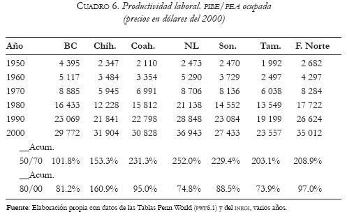 No obstante lo anterior, un dato interesante que surge del análisis de largo plazo de la productividad laboral en los seis estados de la frontera norte es que tanto en el período de 19501970 como en el de 19802000, Sonora se ubicó en la tercera posición, incluso en el segundo período por encima de Nuevo León. La interpretación que sugieren estos datos es que el problema de Sonora no estriba en la calidad de la mano de obra, sino que el descenso en su producto agregado se debe a la falta de absorción de la misma, vía la creación de empresas de mayor contenido tecnológico.