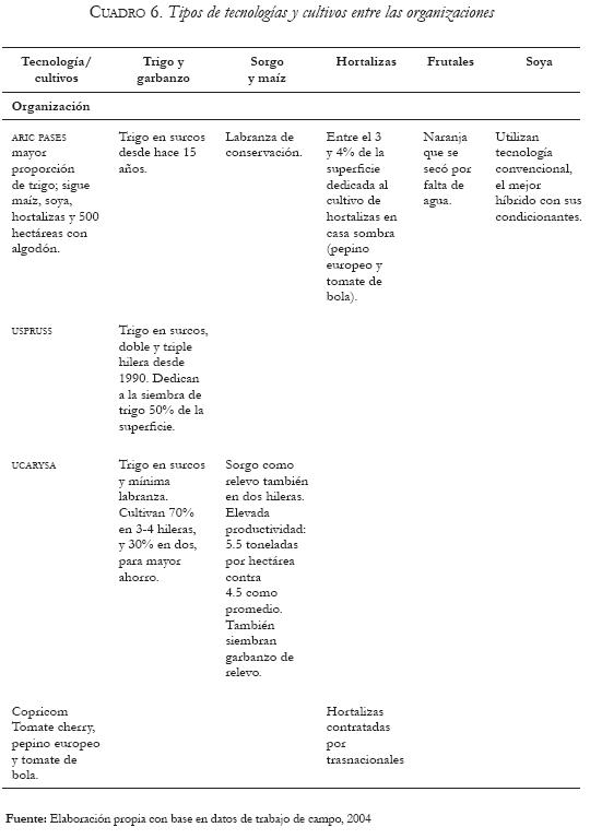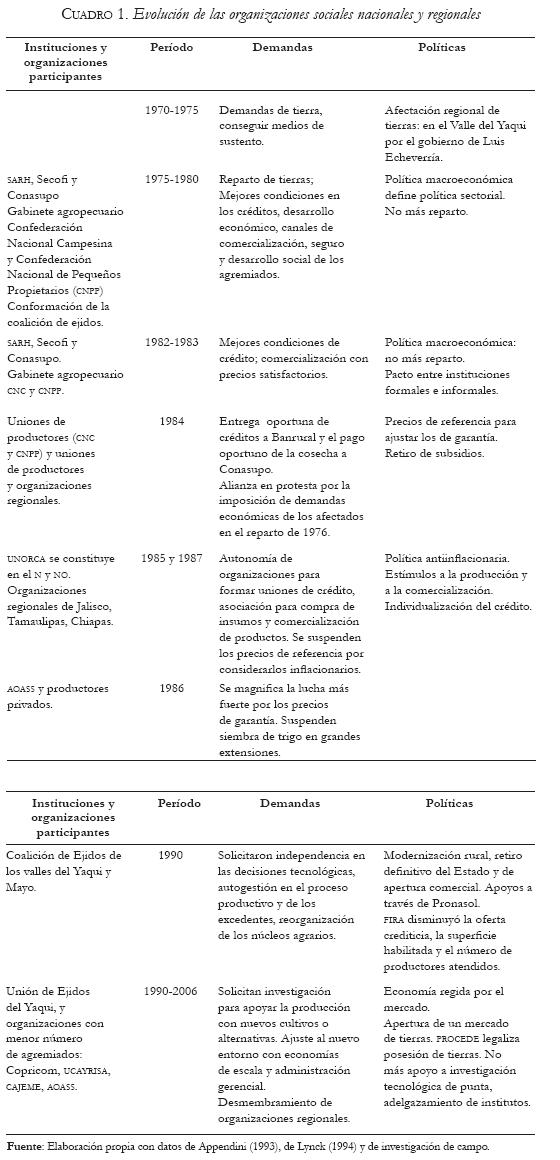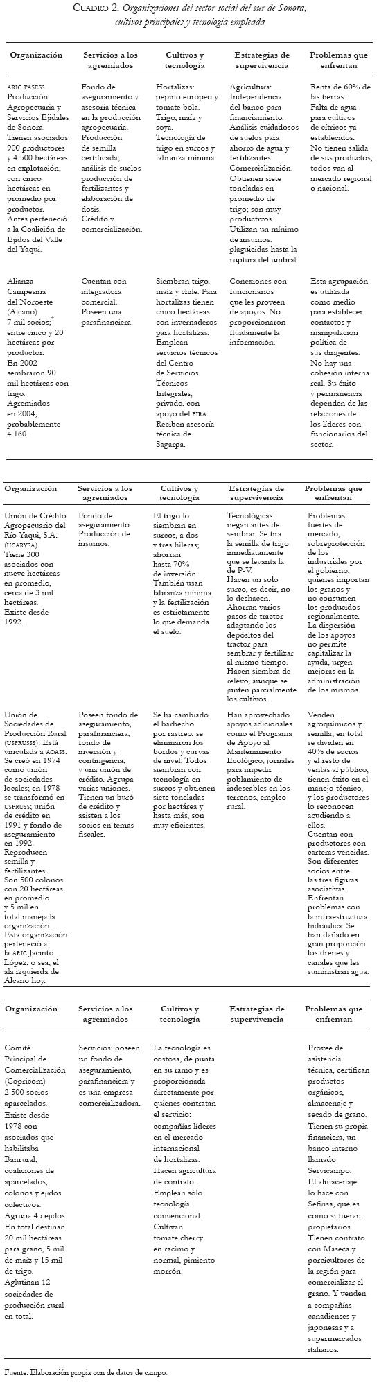 This paper reports a study conducted with small and medium producers of the Valley of the Yaqui in southern Sonora, Mexico, to identify synergies between technological and organizational strategies which have had an influence on growers' organizations in the history of the Valley of the Yaqui region. The experiences of the social agents are examined to review, over a brief regional historical period, what has happened with the organizations and how technological, political and organizational aspects have evolved. Finally, whether the ambivalent agrarian policy undermined the possibility of development for the social strata growers is discussed and reflections are made on whether the social organizations have a propitious atmosphere for their survival.