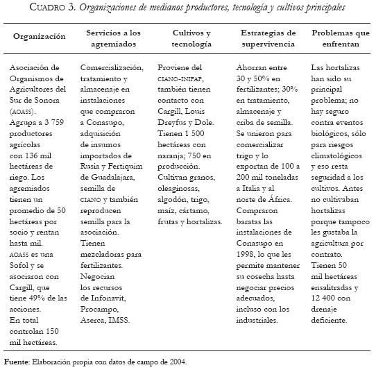 Se engendró, además, un vacío de interlocución; los productores no identificaban a quién encarar ante el desmantelamiento de las empresas del Estado. La dispersión de los apoyos y las nuevas estructuras de representación estatal, que estaban en proceso de ajuste, crearon un ambiente de desconcierto del que algunos, por fortuna, lograron salir. Sobrevivieron aquellos que ya tenían experiencia organizativa y gestión social, así como un adecuado conocimiento tecnológico para cubrir el vacío dejado por el Estado, ejerciendo una autogestión con cierto éxito; este es el caso de organizaciones como la Unión de Crédito Agropecuario del Río Yaqui, S.A. de C.V. (UCARYSA) y el Comité Principal de Comercialización (Copricom).