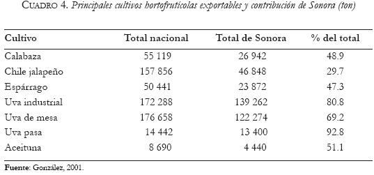 Por su parte, la historia de las hortalizas no ha cambiado sustancialmente desde antes de la firma del TLC. En 1989 Sonora exportó 49 especies hortícolas, con un volumen total de 212 mil toneladas; 16 por ciento del total nacional. Entre las más importantes hasta la fecha están sandía, espárrago, lechuga, coliflor, chiles, tomate, melón cebollón y calabacita. Pero hay investigadores que hablan de más de 100 cultivos potenciales para la zona.14