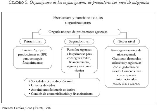En el Valle del Yaqui hay actualmente tres tipos de organización por niveles de importancia (Camiro, 1996): el primer nivel son Sociedades de Producción Rural (SPR) en las que se agrupan ejidos colectivos; trabajan para conseguir recursos financieros. Segundo nivel: agrupan a las primeras para facilitar servicios de crédito, seguro, comercialización y adquisición de insumos. Entre éstas se cuentan las uniones de ejidos, asociaciones rurales de interés colectivo, sociedades de producción rural, uniones de crédito, fondos de aseguramiento, comités de comercialización y asociaciones de productores de hortalizas. Las organizaciones de tercer nivel son de representación regional y gestión de demandas. Entre ellas están las incorporadas a los partidos políticos nacionales como la CNC, Alianza Campesina del Noroeste (Alcano), Asociación de Organismos Agrícolas del Sur de Sonora (AOASS), que aglutina a productores privados grandes y medianos. Las organizaciones de segundo nivel agrupan productores del sector social, en su mayoría colonos, ejidatarios y pequeños propietarios privados.
