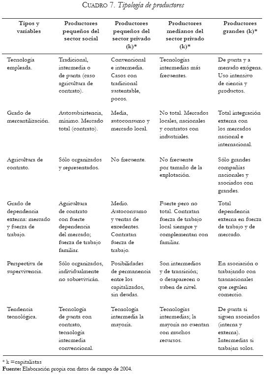 En el cuadro 7 se muestra una tipología cualitativa de productores y las tendencias que se perciben en el mediano plazo para su permanencia en el ámbito de la producción agrícola.