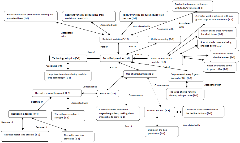 Producers’ perception of traditional coffee production is that despite being more environmentally friendly, it does involve practices perceived as harmful to the environment, including 1) pulping with water, 2) dumping wastewater into water sources, 3) using mattocks or hoes to control weeds or undergrowth, and 4) the improper handling of coffee pulp. Technification, on the other hand, is seen as a way to improve productivity and fight pests and diseases on coffee plantations. Aspects of technification identified by producers include the use of resistant varieties, technology adoption, uniform seeding, cultivation in direct sunlight, the use of agrochemicals, and the renewal of coffee plantations. Resistant varieties are associated with a lower yield compared to traditional varieties. Sun-grown crops entail a loss of shade and tree felling. The use of agrochemicals is linked to a decline in fauna, the absence of household vegetable plots, and the loss of topsoil. However, no negative impact was associated with uniform seeding or crop renewal (see Figure 3).