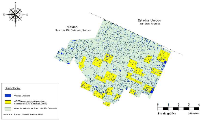 En la ciudad de San Luis Río Colorado, Sonora, se estableció un área de estudio compuesta por la sumatoria de 97 AGEBs, lo que en términos territoriales representa una superficie de 3 686.47 Hectáreas. En el interior de dicha área de estudio fueron localizados y registrados un total de 3 686 vacíos urbanos, lo cual representa una tasa de incidencia de 1.00 vacíos urbanos por cada hectárea. La suma de las superficies individuales de todos los vacíos urbanos resultó en un total de 240.15 hectáreas, lo cual equivale a 6.51 por ciento del área de estudio analizada.