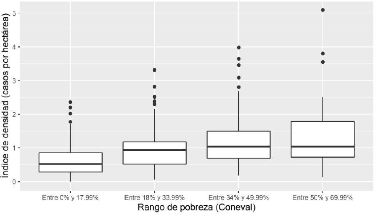 Por otra parte, también resulta de interés estudiar global y simultáneamente la relación entre el índice de densidad y el rango de pobreza en las tres ciudades, para entender el fenómeno de manera más general. Para dicho propósito, se elaboró un gráfico de cajas y bigotes (Gráfica 2) donde se muestran los resultados del análisis de las 358 AGEBs4 en total en las tres ciudades. En dicho gráfico se puede observar que, conforme aumenta el rango de pobreza observado en las AGEBs estudiadas, se incrementa el índice de densidad.