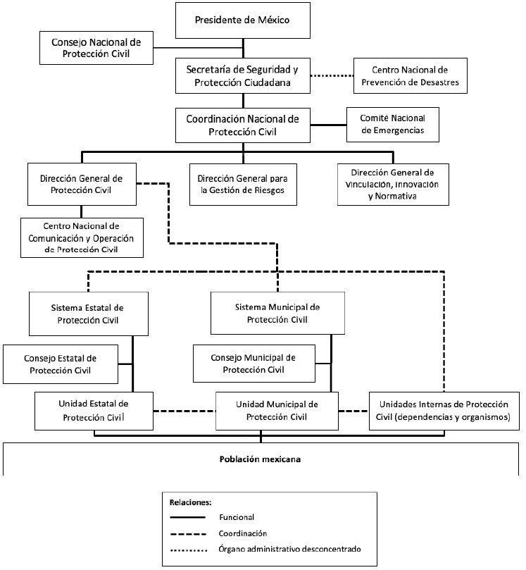 En la estructura del Sinaproc, el presidente de la República ocupa la responsabilidad más alta, la cual ejerce a través de la Secretaría de Seguridad y Protección Ciudadana. La Dirección General para la Gestión de Riesgos (DGGR) tiene a su cargo coordinar la operación de los instrumentos financieros para la gestión de riesgos, analizar las solicitudes de suministro de auxilio para las entidades federativas, así como someter los proyectos de declaratoria de emergencia o de desastre natural. El modelo de gestión del riesgo de desastres en los niveles estatales y municipales es un reflejo del sistema federal, con lo que se pretende implementar acciones y estrategias de manera sistematizada. El nivel municipal es la primera instancia de prevención y atención de los desastres, y en caso de requerirse, intervienen los niveles estatal y federal.