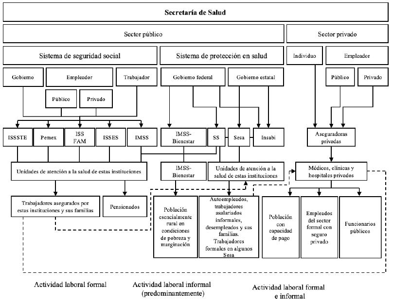 En el SNS intervienen tanto el sector público como privado en la prestación de los servicios de salud. En el sector público se establecen dos tipos de subsistemas, el de seguridad social y el de protección a la salud, los cuales se complementan para atender a la población derechohabiente para el primer caso y el segundo, para la población en general. El financiamiento se logra a través de las partidas del gobierno federal, del empleador y del trabajador, para el primer caso; mientras que para el segundo caso el finamiento lo aporta el nivel federal y estatal, través de los Servicios Estatales de Salud (Sesa) y el Instituto de Salud para el Bienestar. En los dos últimos niveles del sistema se encuentran los usuarios y el ámbito laboral de cobertura (Martínez y Murayama, 2016). Por su parte, el sector privado está constituido por compañías aseguradoras, redes de hospitales y servicios médicos particulares, que prestan sus servicios a personas que carecen de cobertura de salud pública y a usuarios con capacidad de pago (Martínez y Murayama, 2016).