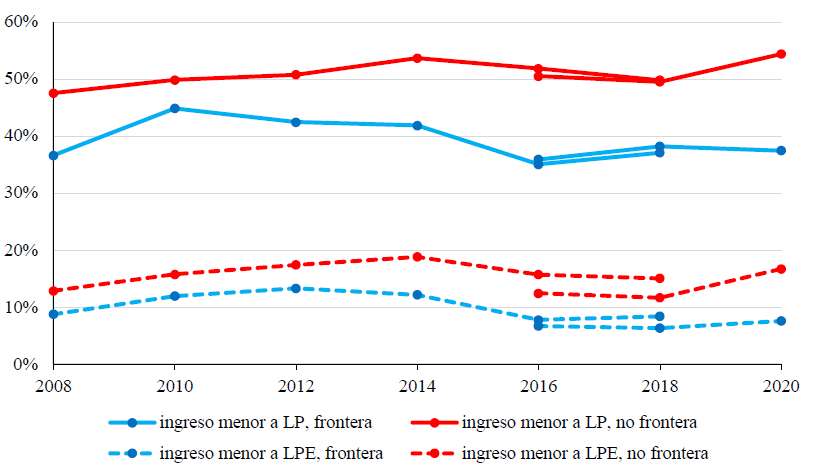 Los datos también recogen los primeros meses de la crisis del COVID-19 en 2020. En este caso, la población no fronteriza fue la más afectada por la pérdida de ingresos. La suspensión temporal de actividades no esenciales y el carácter informal de una mayor proporción de empleos pudo impulsar los aumentos de 4.87 y 5.06 puntos porcentuales que tuvieron lugar de 2018 a 2020 en la población con ingreso menor a la LP y a la LPE, respectivamente. En ese mismo período, en la zona fronteriza la pobreza de ingreso incluso se redujo en 0.73 puntos, mientras que la pobreza extrema aumentó 1.25.