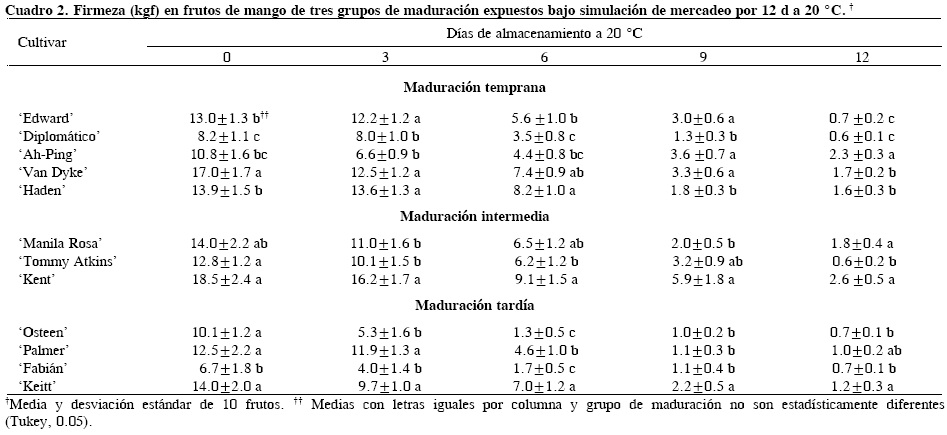 Es importante hacer notar que los frutos de 'Fabián' presentaron en esta temporada de evaluación y en la reportada por Siller-Cepeda et al. (1994) valores de firmeza por debajo del mínimo aceptable, lo que podría indicar que este cultivar debió clasificarse y cosecharse dentro de la categoría de madurez intermedia, aunque sus características de corte no estaban bien definidas para esa etapa de desarrollo. Esta discusión es acorde con lo reportado por Mosqueda et al. (1996), quienes lo agruparon en madurez intermedia junto con 'Tommy 'Atkins'.