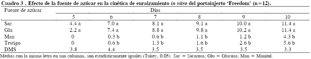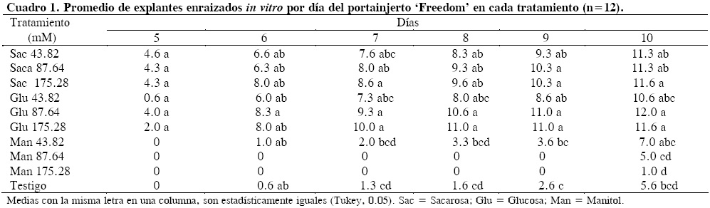 La velocidad de enraizamiento fue diferente en cada portainjerto. En 'Freedom' a los 5 d habían enraizado 2.2 brotes en glucosa y 4.4 en sacarosa, mientras que en manitol y testigo no había enraizamiento (Cuadro 3). El número de brotes con raíces se incrementó en forma gradual de los 5 a los 10 d, sobre todo con sacarosa y glucosa en donde enraizaron 11.4 brotes de 12 y superaron (P ≤ 0.05) a manitol y al testigo. El hecho de que el número de brotes enraizados en el testigo haya sido bajo (5.6) se puede deber a la falta de azúcar como fuente de energía de los explantes, lo que demuestra que las condiciones fisiológicas de los brotes difiere entre medios, aún cuando tengan el mismo tamaño. El efecto retardante del manitol se puede deber a la menor capacidad de los explantes para metabolizar este carbohidrato, como mencionan Welander et al. (1989).