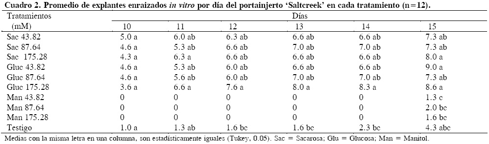 Para los brotes del portainjerto 'Saltcreek' la tendencia fue similar a la observada en 'Freedom', aunque el enraizamiento inició hasta los 10 d. En este caso, el mayor número de explantes con raíces también se registró en el medio de cultivo con sacarosa y glucosa (4.6 y 4.3, respectivamente) y se elevó hasta 11.4 a los 15 d, y superaron (P ≤ 0.05) a los tratamientos con manitol y testigo, donde solo enraizaron 4.3 y 5.6 brotes (Cuadro 4).