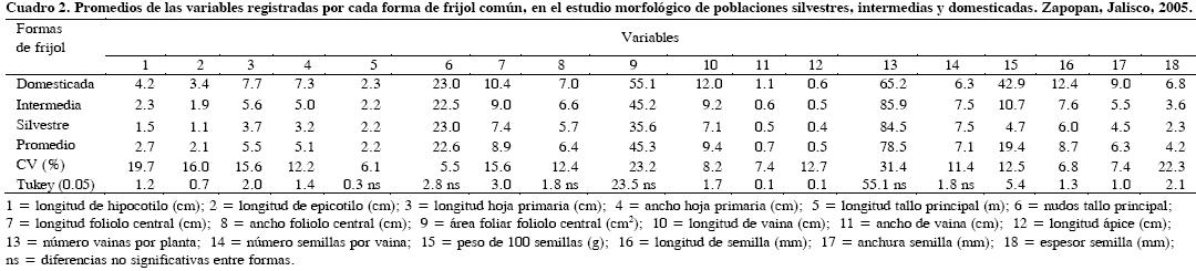 En longitud de vaina y peso de 100 semillas, los valores fueron de 7.15 vs. 11.96 cm y de 4.68 vs. 42.93 g, respectivamente; en ambos caracteres el incremento logrado por el proceso de domesticación es evidente y de manera especial en tamaño de semilla, variable que aumentó en 9 veces. Los resultados de esta caracterización muestran que las formas de frijol cultivada y silvestre, son dos grupos morfológicamente diferentes.