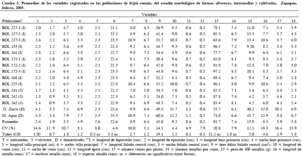 En la forma intermedia de frijol conocida como tipo maleza, con excepción de longitud de tallo y número de nudos, para todas las variables se registraron valores intermedios entre las formas cultivada y silvestre (Cuadro 2) . Al comparar la forma tipo maleza con la forma domesticada, las diferencias fueron significativas (P ≤ 0.05) en 10 de las 18 variables analizadas. En longitud de hipocotilo y epicotilo, longitud y anchura de hoja simple, longitud y anchura de vaina, longitud, anchura y espesor de la semilla y peso de 100 semillas, las poblaciones intermedias mostraron valores menores a los registrados en las poblaciones cultivadas. Este resultado es similar a lo observado entre las formas domesticada y silvestre, e indica también que los frijoles intermedios constituyen un grupo diferente a los frijoles cultivados.