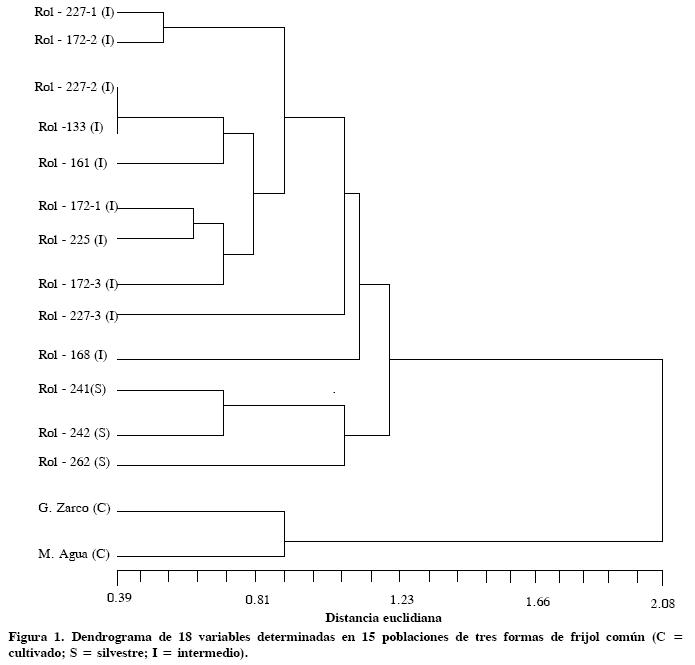 El análisis de agrupamiento mediante la distancia euclidiana (Figura 1), muestra la separación de las tres formas de frijol. Las poblaciones domesticadas forman un grupo que se separa de las silvestres a una distancia de 2.08, mientras que las silvestres se diferencian de las intermedias a una distancia de 1.23; es decir, las formas silvestre e intermedia son más cercanas entre sí que con respecto a los frijoles cultivados. Estos resultados presentan similitud con lo encontrado por Zizumbo et al. (2005), al separar las formas cultivadas, intermedias y silvestres de frijol común.