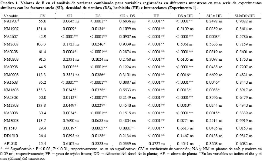 Los resultados de este estudio exploratorio constituyen las primeras evidencias sobre manejo agronómico del anís de monte en siembra directa, que influye en la incidencia de maleza y en el establecimiento, morfología y rendimiento del anís en condiciones de temporal o secano. Los altos coeficientes de variación, de 30 a 60 % para la variable número de plantas de anís por metro cuadrado y de 91 a 133 % para número de malezas por metro cuadrado (Cuadro 1), evidencian un alto error experimental, y se atribuyen a heterogeneidad de plantas de anís o de maleza en la población; por ejemplo, la emergencia de plántulas de anís en diferentes tiempos está asociada con la latencia de las semillas, por tratarse de una especie silvestre.