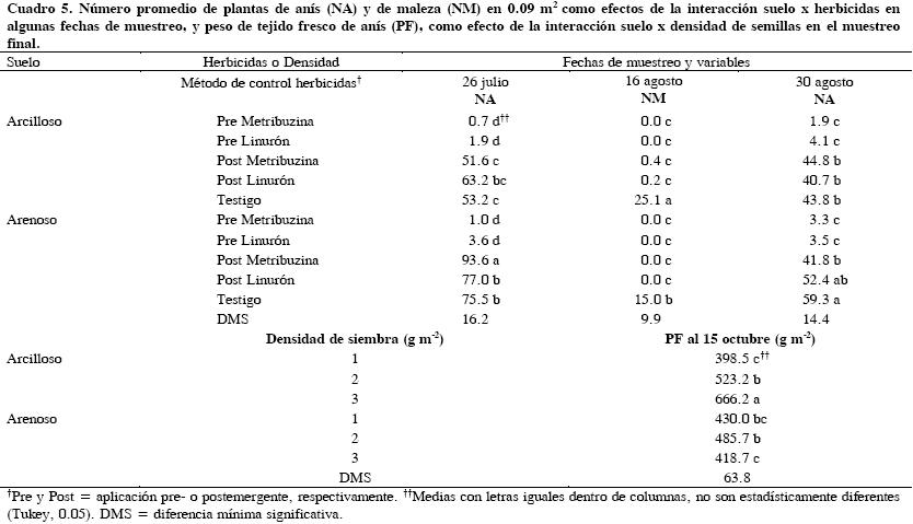 En suelo arcilloso la densidad de siembra de 3 g de semilla/m2 produjo el mayor (P ≤ 0.05) rendimiento de biomasa del anís (666 g m2), mientras que en suelo arenoso la densidad de 2 g m2 fue mejor (485 g m2) (Cuadro 5). En Ocuituco, Morelos la mayoría de terrenos son arcillosos con manchones de suelo arenoso, además de algunos de mayor superficie que son de suelo arenoso. La interacción suelo × herbicida, en los muestreos del 26 de julio y del 16 y 30 de agosto, mostró que tanto metribuzina como linurón aplicados en postemergencia permitieron el establecimiento de más plantas de anís en suelo arenoso y con mejor control de la maleza (Cuadro 5); en el resto de variables evaluadas y en la mayor parte de los muestreos, no hubo efecto de esta interacción (Cuadro 1).