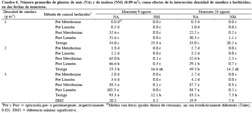 Con alta densidad de siembra y con aplicación de herbicidas en forma postemergente, en todos los muestreos hubo más (P ≤ 0.05) plantas de anís y menos de maleza (Cuadro 6), comportamiento que evidencia una referencia importante de la efectividad selectiva de estos herbicidas una vez que las plántulas de anís han emergido, resultados que son útiles para el manejo agronómico del anís de monte. Después de la aplicación postemergente de herbicidas, la disminución en el número de plantas de maleza estuvo inversamente relacionada con la cantidad de semillas de anís sembradas; el efecto de competencia entre las plantas de maleza con las de anís puede ejemplificarse en el testigo donde se registraron 20 plantas de maleza en la densidad de siembra 1 g de semilla, cantidad que disminuyó a 14 con 2 g y hasta 7 plantas de maleza con 3 g. La falta de respuesta en biomasa y en altura de la planta del anís de monte a la interacción (excepto densidad × textura de suelo; Cuadro 1), permite inferir que tales factores combinados no son de importancia en la expresión de las variables aquí referidas.