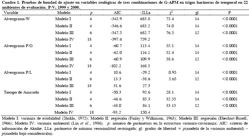 Con los cuatro modelos de estabilidad se encontraron diferencias significativas (P ≤ 0.01) en todas las variables reológicas para las combinaciones de GAPM; es decir, las propiedades viscoelásticas de la masa conferidas por las combinaciones de gluteninas difirieron entre ambientes de prueba. En el Cuadro 1 se muestran los valores de bondad de ajuste (R2) de los diferentes modelos probados. El mayor valor de AIC para alveogramaW y alveogramaP/G correspondió al modelo de varianza de estabilidad, por lo que de acuerdo con Wolfinger (1993), la estabilidad de las combinaciones de GAPM a través de ambientes deberá estimarse con este modelo; en contraste, en alveogramaP/L y tiempo de amasado el modelo que mejor se ajustó fue el de regresión de Finlay y Wilkinson (1963). De manera general, cada propiedad reológica se ajustó a modelos diferentes, igual a lo observado por Robert y Denis (1996), quienes con 10 variedades de trigo en 14 ambientes encontraron interacción significativa de la calidad × ambiente, lo que indicó que las variables reológicas deben ser analizadas por separado para definir el método que mejor se ajuste en la evaluación de la estabilidad de la calidad panadera.