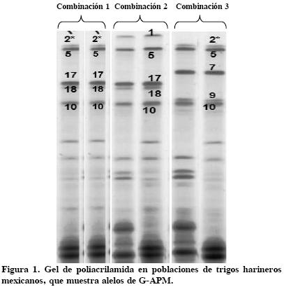 Las variedades 'Náhuatl F2000', 'Pavón F76' y 'Temporalera M87' poseen las subunidades de GAPM en GluA1 2*, GluB1 17 + 18 y GluD1 5+10, por lo que se agruparon para conformar la Combinación 1; las variedades 'Rebeca F2000', 'Tlaxcala F2000', 'Gálvez M87', 'Zacatecas VT74' y 'Romoga F96' poseen las subunidades de GAPM en GluA1 1, GluB1 17 + 18 y GluD1 5+10, e integrando la Combinación 2; mientras que las variedades 'Juchi F2000' y 'Batán F96' poseen las subunidades de GAPM en GluA1 2*, GluB1 7+9 y GluD1 5+10, y se agrupan en la Combinación 3. La combinación de gluteninas de alto peso molecular con mayor estabilidad y con aceptable fuerza de la masa para la industria mecanizada fue 1, 17 + 18, 5 + 10. La Combinación 2*, 7+9, 5+10 proporciona buena extensibilidad de la masa, pero es la menos estable a través de ambientes.