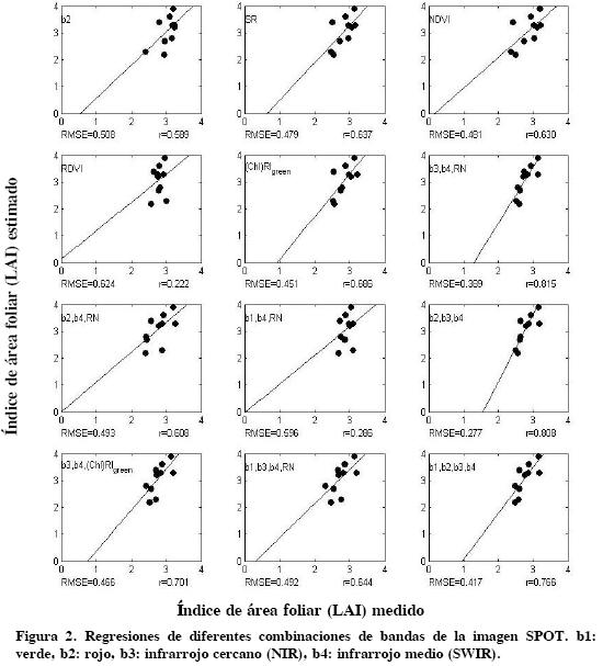 El Cuadro 2 muestra las combinaciones de bandas e índices que proporcionaron un mejor ajuste de los valores de índice de área foliar medidos en campo, al considerar 2/3 de los ESUs. Las combinaciones (b2, b4, RN), (b1, b3, b4, RN) y (b1, b2, b3, b4) (siglas según Cuadro 1) fueron las que presentaron un mejor coeficiente de determinación (R2), que en ningún caso llegó a 0.5, con errores ponderados y cruzados relativamente bajos.