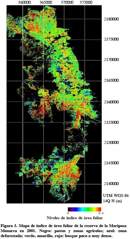 Finalmente, la función de transferencia se aplicó a la imagen de toda la Reserva de la Mariposa Monarca, para obtener el mapa de índice de área foliar correspondiente a finales de 2001 (Figura 3), sin considerar zonas agrícolas (en negro en la figura). Como en la imagen de la zona VALERI, a los claros se les asignó un valor de índice de área foliar bajo (en negro en la figura). La aplicación de la ecuación de transferencia pone de relieve las zonas deforestadas (en azul en Figura 3).