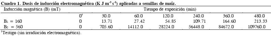 En febrero del 2007 en el laboratorio se aplicó un método físico de campo magnético como tratamiento a la semilla maíz previo a la siembra y la inducción magnética se midió en Teslas (T), la unidad de inducción magnética (1T = 1 V·s m2 = 1 kg · s2 · A1). El prototipo irradiador usado genera el campo electromagnético por el paso del flujo de corriente a través de cuatro inductores (bobinas), y mediante un interruptor se selecciona el nivel de corriente que alimenta al sistema para así tener el nivel deseado de inducción magnética. Las semillas se colocaron aleatoriamente en un recipiente dieléctrico que se ubicó dentro del campo magnético. Como el campo magnético cambia de la periferia hacia el centro, el contenedor de semillas se colocó dentro de un espacio homogéneo. Los valores de inducción magnética aplicados fueron de B1 = 160 y B2 = 560 mT, y se sometieron a seis tiempos de exposición (Cuadro 1).