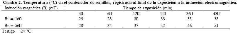 La dosis de exposición (Dexp) descrita como: Dexp ρm t; donde: ρm = ½ µo Hm2, es la densidad de energía de campo magnético (J·m3), µo es la permeabilidad de vacío, Hm es la intensidad de campo magnético dado en amperes por metro (A·m1), y t es el tiempo de exposición en s (Pietruszewsky, 2007). Durante la irradiación de la semilla, su temperatura se incrementó debido al efecto Joule generado en las bobinas; por ello se registró la temperatura en el contenedor de la semilla, al término de la irradiación de cada tiempo aplicado (Cuadro 2). La inducción magnética se midió con un gaussómetro (Lakeshore®, modelo 410 Westerville, OH, USA).
