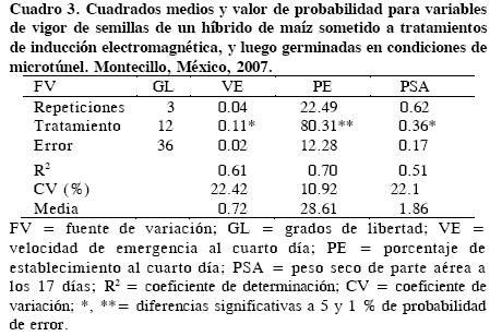 Al considerar la definición de la Asociación Oficial de Análisis de Semillas (AOSA, 1983) para el vigor, "propiedades de las semillas que determinan el potencial para una rápida y uniforme emergencia de plántulas y desarrollo de plántulas normales bajo un amplio rango de condiciones de campo", los resultados aquí obtenidos confirman que la radiación electromagnética es un método viable para incrementar el vigor de la semilla, porque se traduce en incrementos en la velocidad de emergencia, porcentaje de establecimiento y peso seco de la parte aérea de las plántulas. Resultados similares fueron observados por Alexander y Doijode (1995), quienes lograron en semillas de arroz (Oryza sativa L.) un incremento de 161 % en germinación con respecto al testigo, y de 127 % en germinación de cebolla, mediante estimulación con electromagnetos. Asimismo, en experimentos con semillas de otras variedades maíz expuestas a niveles de inducción magnética de 125 mT y 250 mT aplicados con imanes permanentes a distintos tiempos de exposición de campo magnético, observaron un incremento en altura y peso de la plántula (Flórez et al., 2007). Es importante considerar que la semilla de maíz es un sistema complejo, de tal manera que cuando se aplica la estimulación magnética se deben tener en cuenta las condiciones específicas de la semilla por un lado, y por el otro las características de la fuente de radiación electromagnética para producir efectos de bioestimulación. Hernández et al. (2009) reportaron diferencias entre los patrones de comportamiento de variables evaluadas de vigor en tres diferentes genotipos de maíz (hibridos del ciclo agrícola 2006, 'CL4 X CL1', 'CL13 X CL1'y 'CL12 X CL11'), pues con los mismos parámetros de irradiación, esto es inducción magnética y tiempo de irradiación, hubo tres efectos nulo: positivo y negativo; eso indica que cada variedad puede comportarse de forma diferente a niveles similares de irradiación.