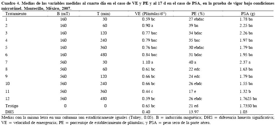 Al cuarto día de iniciada la emergencia de las plántulas, se observaron diferencias (P ≤ 0.05) entre tratamientos de radiación electromagnética para velocidad de emergencia (VE) y porcentaje de establecimiento de plántulas (PE), y al final de la prueba (17 d) en el peso seco de la parte aérea (PSA) (Cuadro 3).